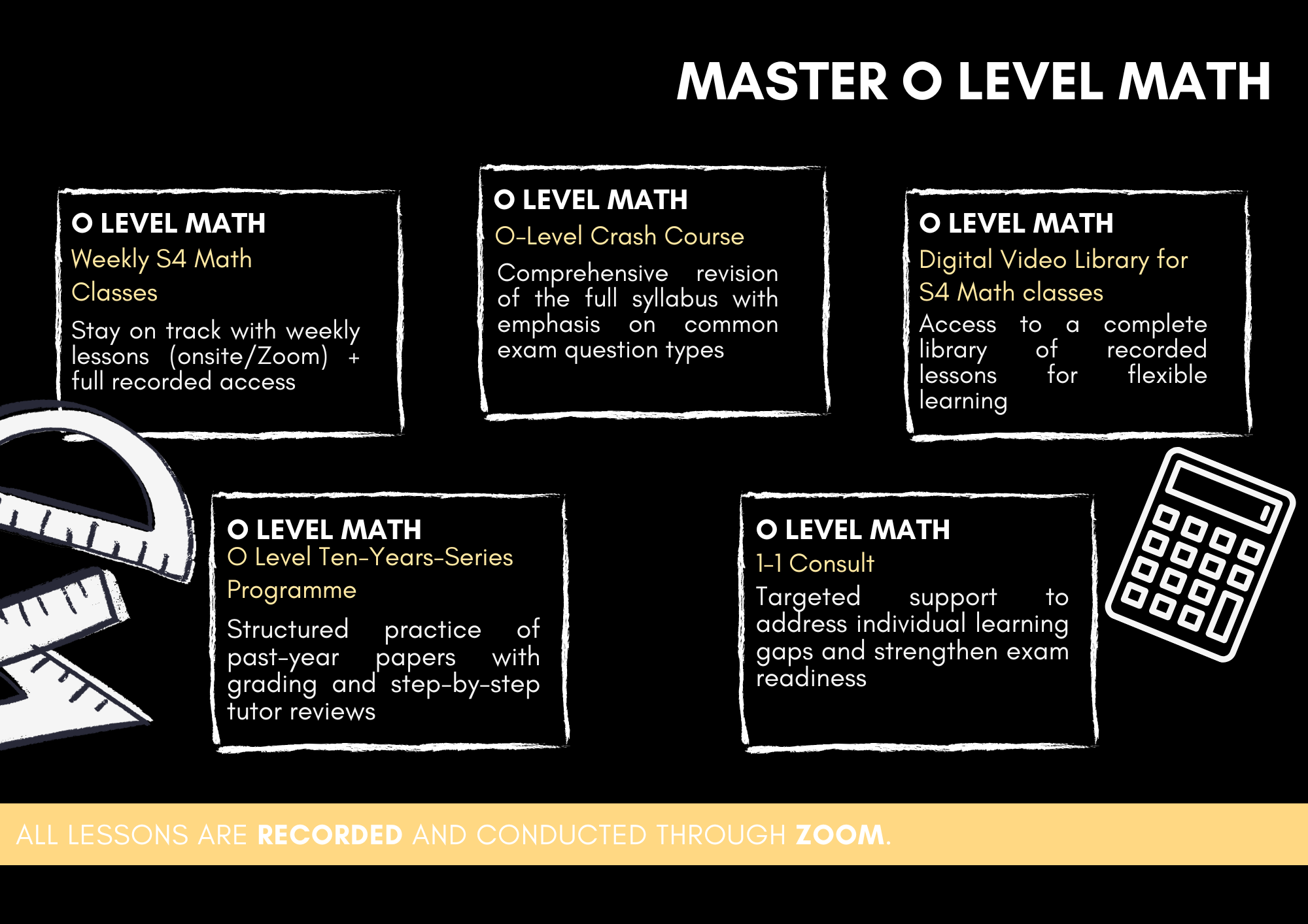 Guided lesson recordings of past 10 years O Level E Math papers with our co-founders + submit answers for grading
